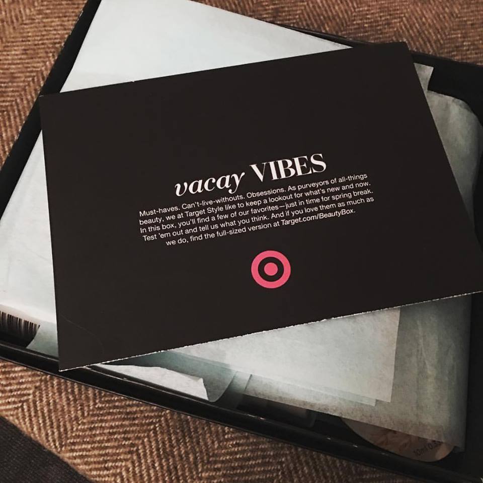 “Must-haves. Can’t-live withouts. Obsessions. As purveyors of all-things beauty, we at Target Style like to keep a lookout for what’s new and now. In this box, you’ll find a few of our favorites-just in time for spring break. Test ’em out and tell us what you think. And if you love them as much as we do, find the full-sized versions at Target.”