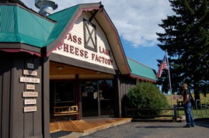 In addition to fresh cheese Bass Lake offers made to order sandwiches, pizzas, soft serve ice cream and cool drinks. They have a good selection of beer and wine to go along with the cheese you bought. The factory also sells an array of jams, jellies, and syrups from local Wisconsin companies. The best part of the factory is the viewing window that looks into the factory. Yes, you can watch them make cheese and stroll through their collection of antique cheese making equipment. Bass Lake has a large deck outside and welcomes bikers. So why not get lost and find your way to the Bass Lake Cheese Factory.