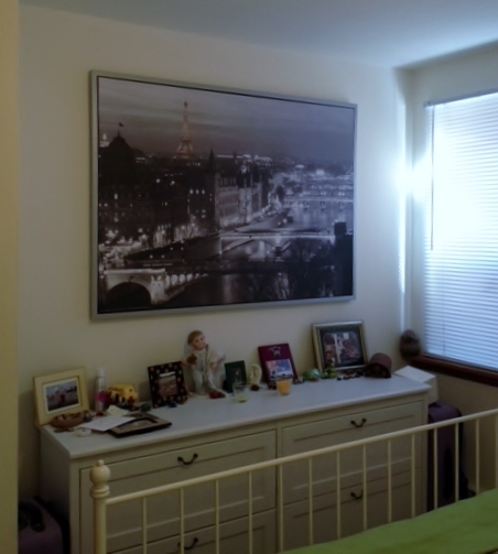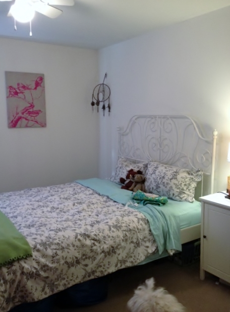 I rest my head next to the muppet each night. I wanted my bedroom to be simple yet quaint. Again I have pops of color to brighten my morning. Each day I wake up to Pairs. How can you not wake up smiling when the first thing you see is a photo of Paris. When it came to linens I had to keep my trusty muppet in mind. I didn’t want any thing fussy or with a tag that read “dry clean only.” If you have a dog then you know how dirty they can and will be. Cullen thinks its fun to roll on the bed when he is muddy and wet. My coverlet is from IKEA and the sheets are from Target. Both can be machine washed and they are pretty darn cozy. My dresser is lined with turtles and photos of family and friends. I have a few paintings on my walls as well. To me my room is well-organized (I love organized spaces) and cozy. I don’t know about you but instead of a monster under my bed I have a muppet. Cullen when he gets to warm or tired of my tossing and turning leaps off and curls up under the bed. The muppet is a funny one. One of his favorite words is “Nap.” He goes nuts when I ask him if he wants to take a nap. He jumps right in bed and snuggles up next to me licking my cheek as I fall a sleep.