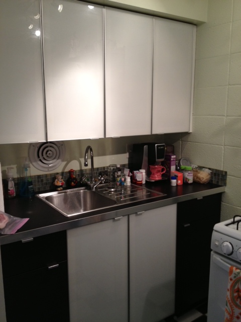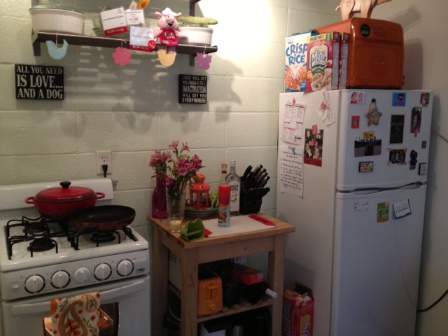 Enough about sleeping. After all everyone knows the real magic happens in the kitchen. An well my kitchen is literally from the pages of the IKEA catalog. My kitchen is small, however I am not complaining and I make it work. Many tasty things have come out of my kitchen and many more have yet to be made. The muppet is always nestled at my feet as I cook. He loves it when we make bacon an waffles for breakfast. I always make a little extra for sharing.